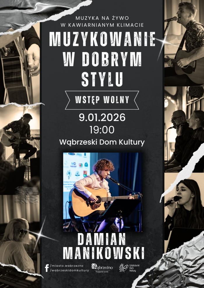 9 stycznia o godz. 19:00 w Wąbrzeskim Domu Kultury wystąpi dwóch artystów: Damian Manikowski – muzyk, nauczyciel gitary i tańca w Międzynarodowej Szkole Sokrates oraz Julian Prus – wokalista i multiinstrumentalista. – Ich szlaki przecięły się na Uniwersytecie Kazimierza Wielkiego w Bydgoszczy i od sześciu lat wspólnie grają i rozwijają swoje muzyczne projekty i pasje – informują organizatorzy.