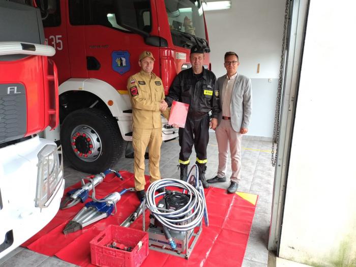 Komendant powiatowy Państwowej Straży Pożarnej w Wąbrzeźnie st. kpt. Robert Stasiak przekazał druhom z Ochotniczej Straży Pożarnej w Kurkocinie zestaw narzędzi hydraulicznych. W przekazaniu bardzo przydatnego i potrzebnego w akcjach ratowniczych sprzętu uczestniczył wójt gminy Dębowa Łąka Mateusz Rutkowski. Doposażenie jednostki OSP w Kurkocinie było możliwe dzięki współpracy Komendy Powiatowej Państwowej Straży Pożarnej w Wąbrzeźnie z Gminą Dębowa Łąka.